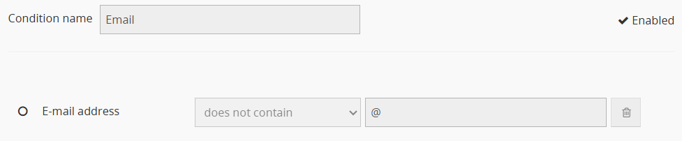 Go to Orders > Rules Engine > Add New Rule. Set a condition to check if the “@” symbol is missing from the email address field. As an action, you can tag the order or move it to a specific folder for review: