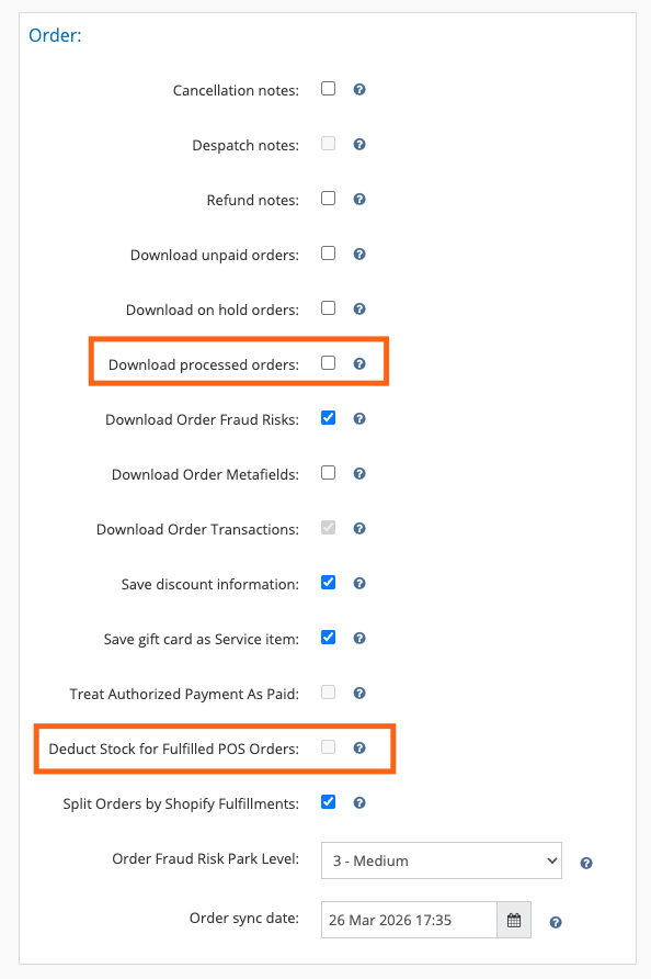 | POS order fulfilled on Shopify, “Download processed orders” OFF | Order does not download |